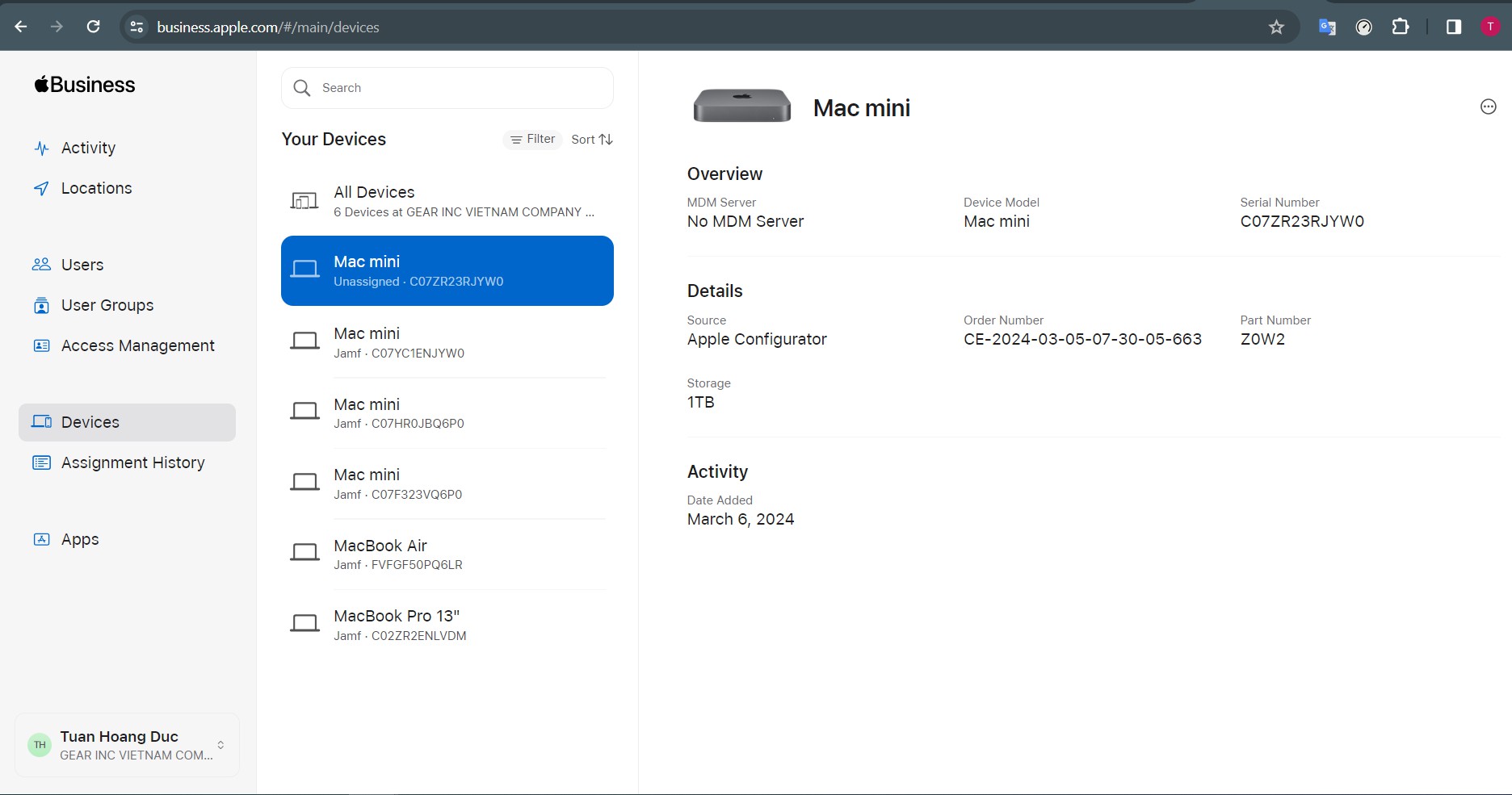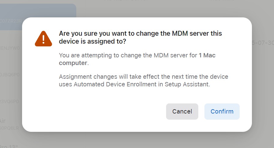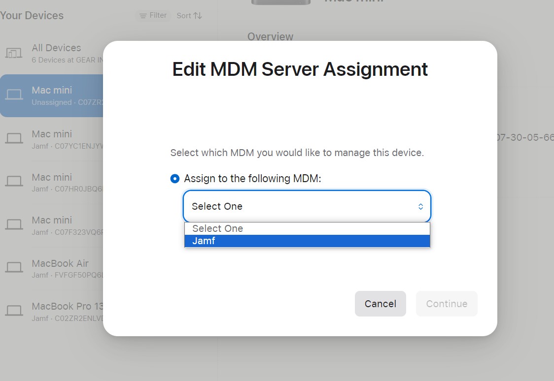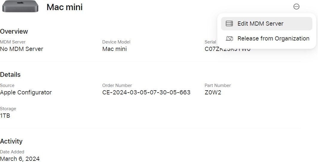 Select the correct device that was just added to the Apple Business Management system. Click Option > Edit MDM SERVER