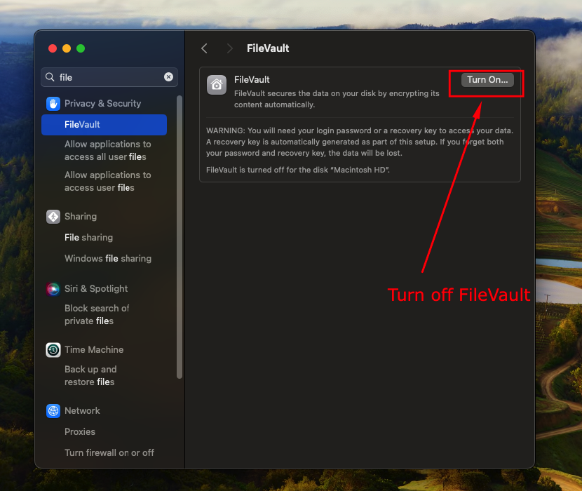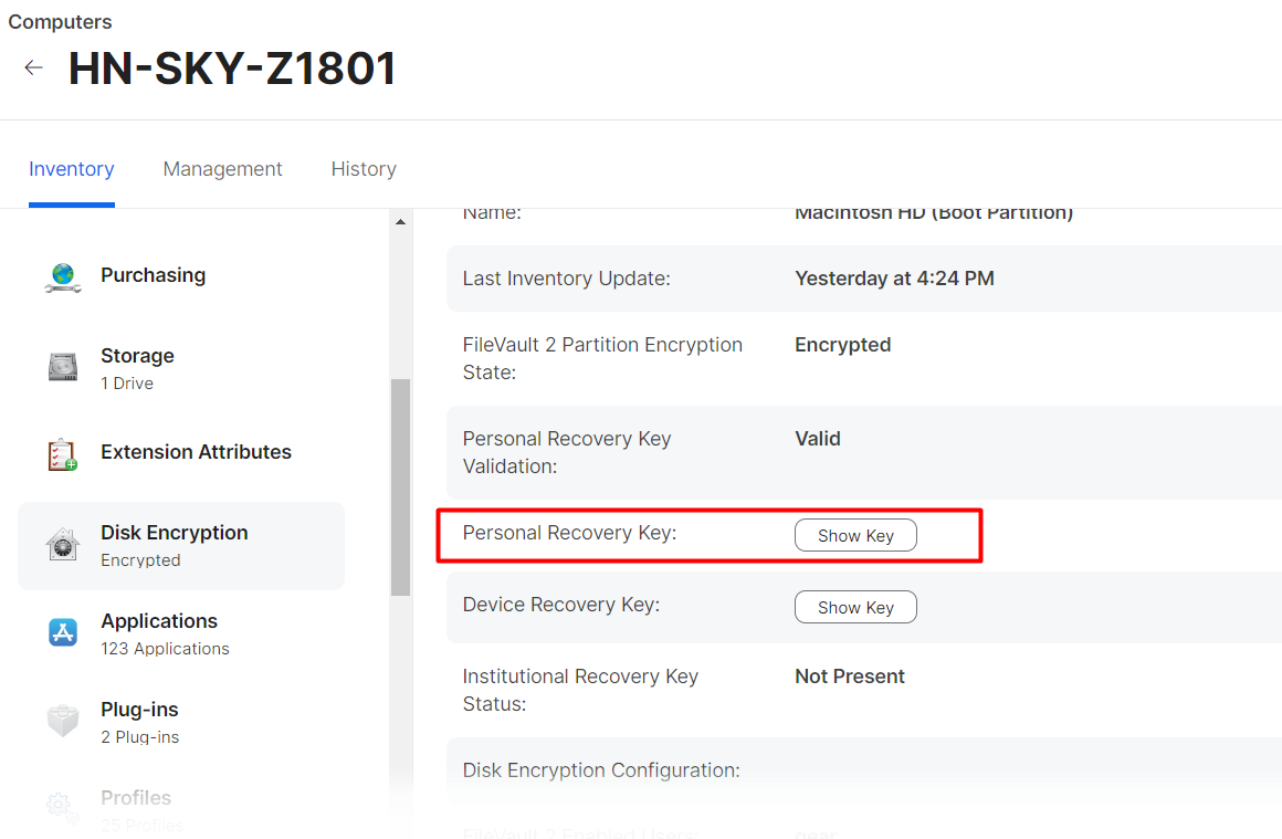 - In the Disk Encryption section, check if the Personal Recovery Key is active and if the "Show Key" button is available.